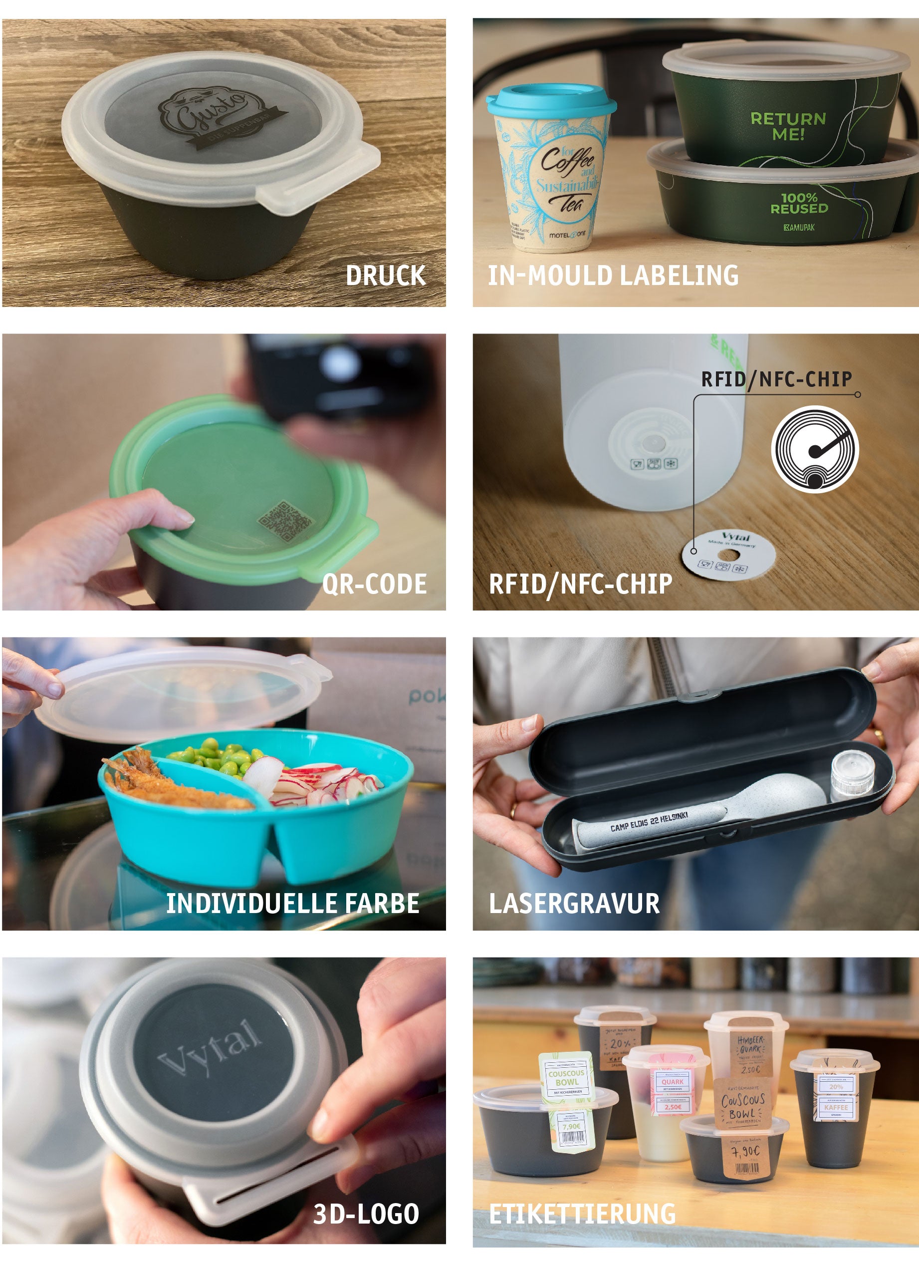 Make a wish! For the perfect appearance, we individualize your products according to your CI! Almost any desired color is possible, and different technologies such as pad printing, luxury print, in-mold labeling or laser engraving are available for applying logos and motifs.