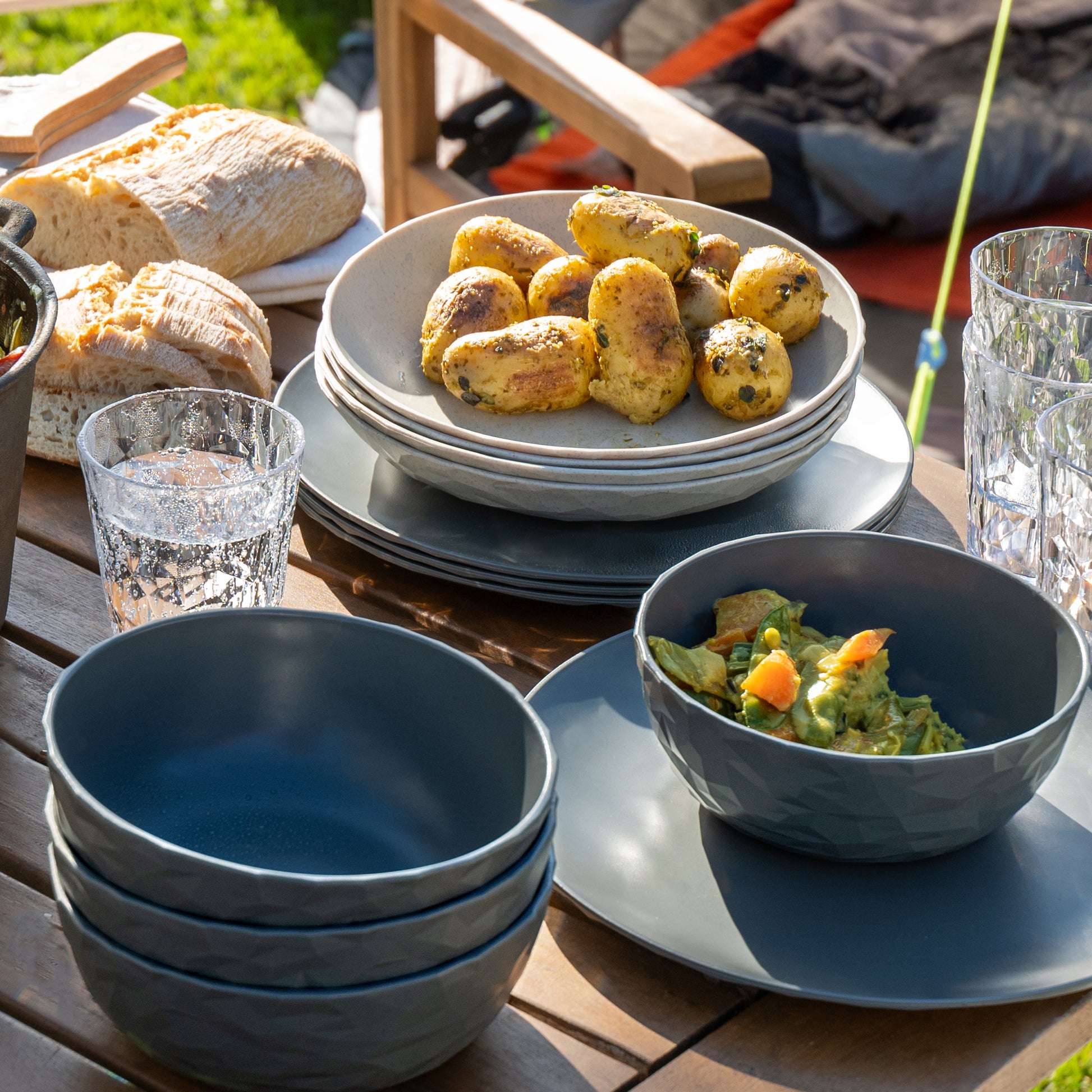 Der universelle Teller für Gartenfeste, Picknicks oder Glamping und alle Anlässe, die vorzugsweise draußen stattfinden. Die Außenseite trägt eine lebendige Facettenstruktur und seine solide Qualität und breite Standfläche vermitteln jederzeit und überall das gute Gefühl hochwertigen Dinierens. Ideal für alle Outdoor-Aktivitäten, bei denen man auf stilvolles Geschirr keineswegs verzichten möchte.